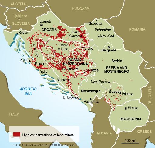 Und die Gefahr war groß: Laut kroatischem Minenaktionszentrum waren zu diesem Zeitpunkt über 500 km2 des Landes vermint. Mehr als 50.000 Minen und fast genauso viele Blindgänger lagen damals noch immer im Boden. In Bosnien-Herzegowina ging man sogar von 120.000 Landminen auf circa 1.200 km2 aus.